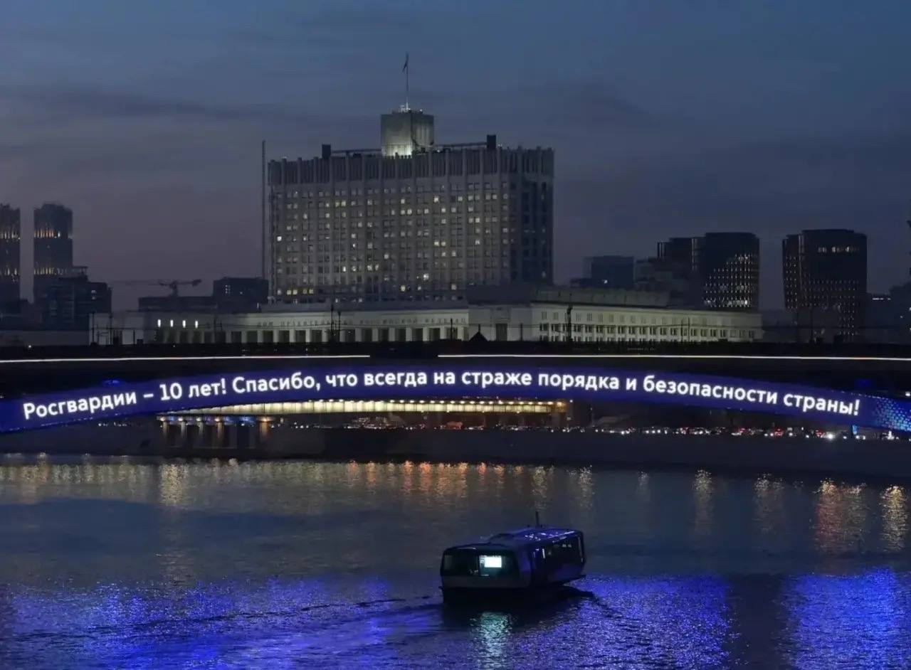 Символы юбилея Росгвардии и поздравительные надписи по этому прекрасному поводу – на медиафасаде Останкинской телебашни и знаменитом Смоленском метромосту через Москву-реку.