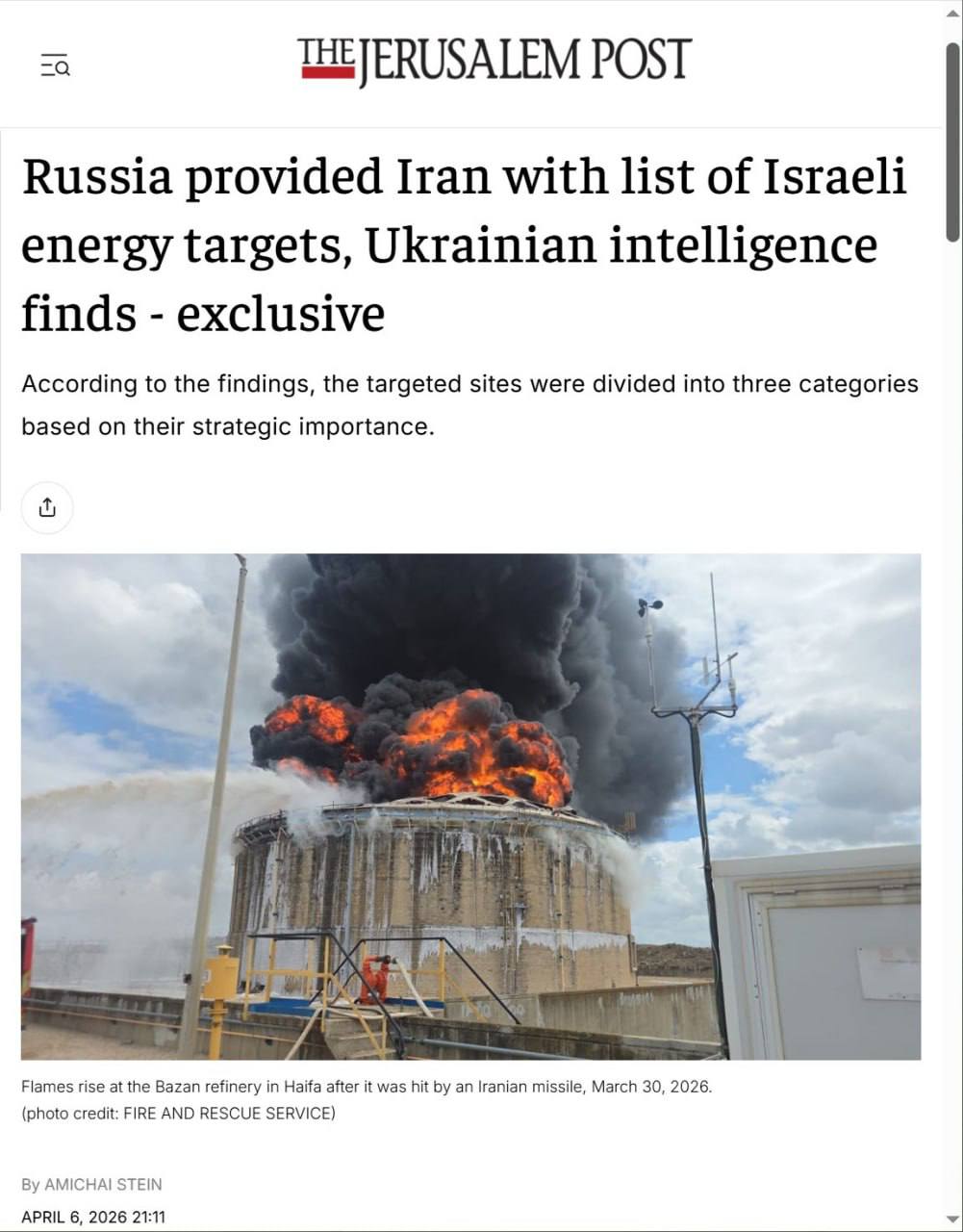Военная разведка ВСУ, по данным Jerusalem Post, утверждает, что Москва якобы передала Тегерану список из 55 ключевых объектов энергетической инфраструктуры Израиля.