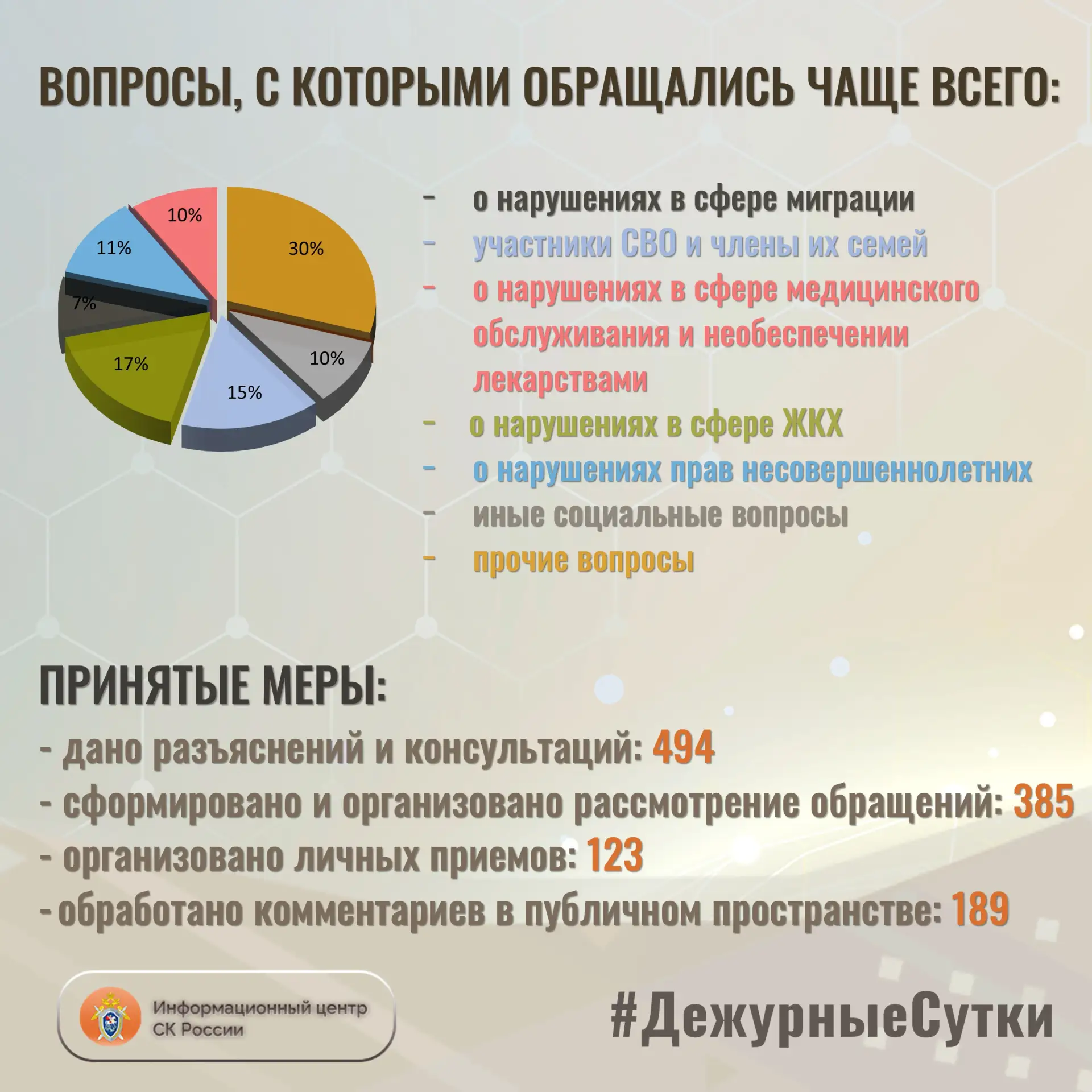 В Информационный центр СК России за прошедшие сутки всего обратилось граждан: 879