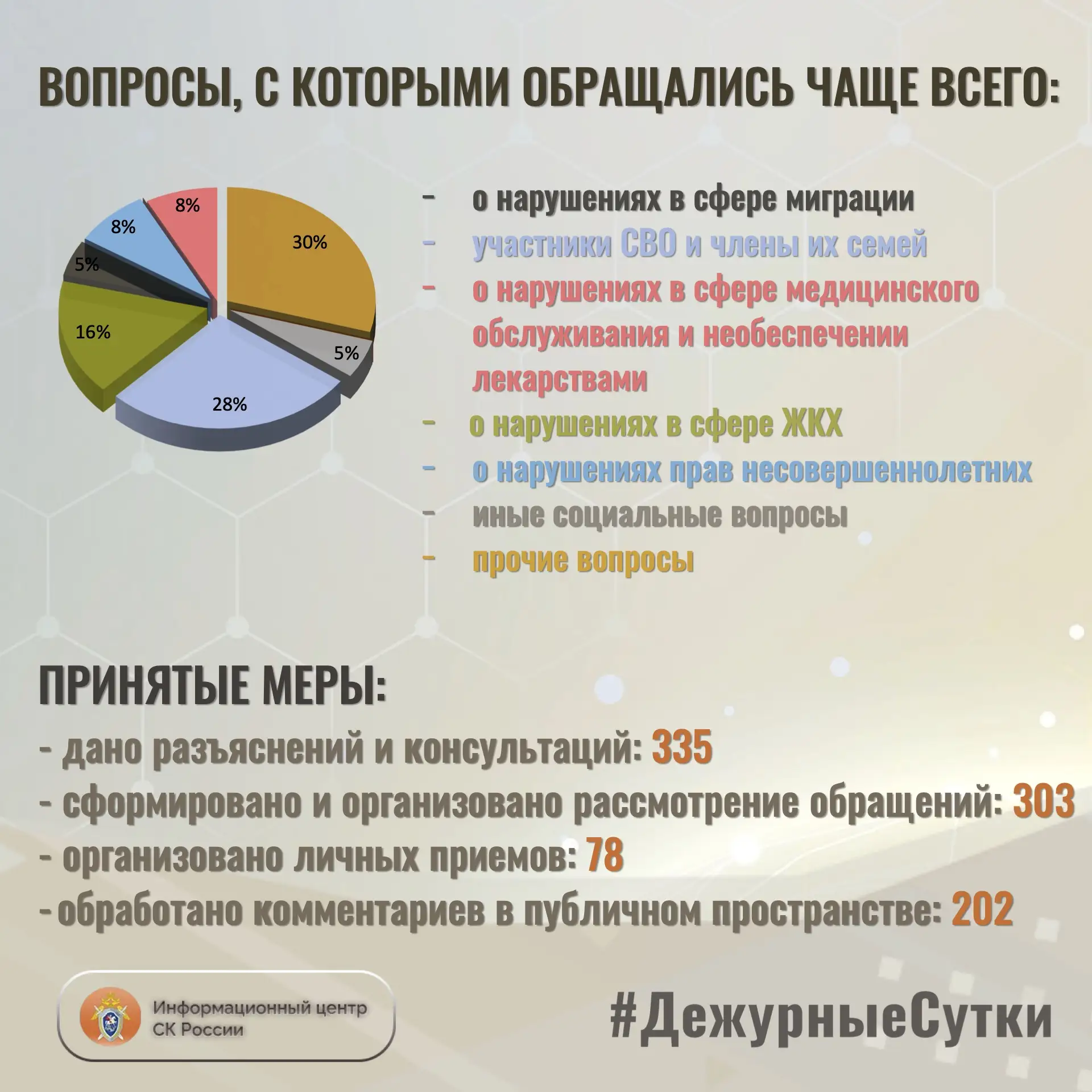 В Информационный центр СК России за прошедшие сутки всего обратилось граждан: 638