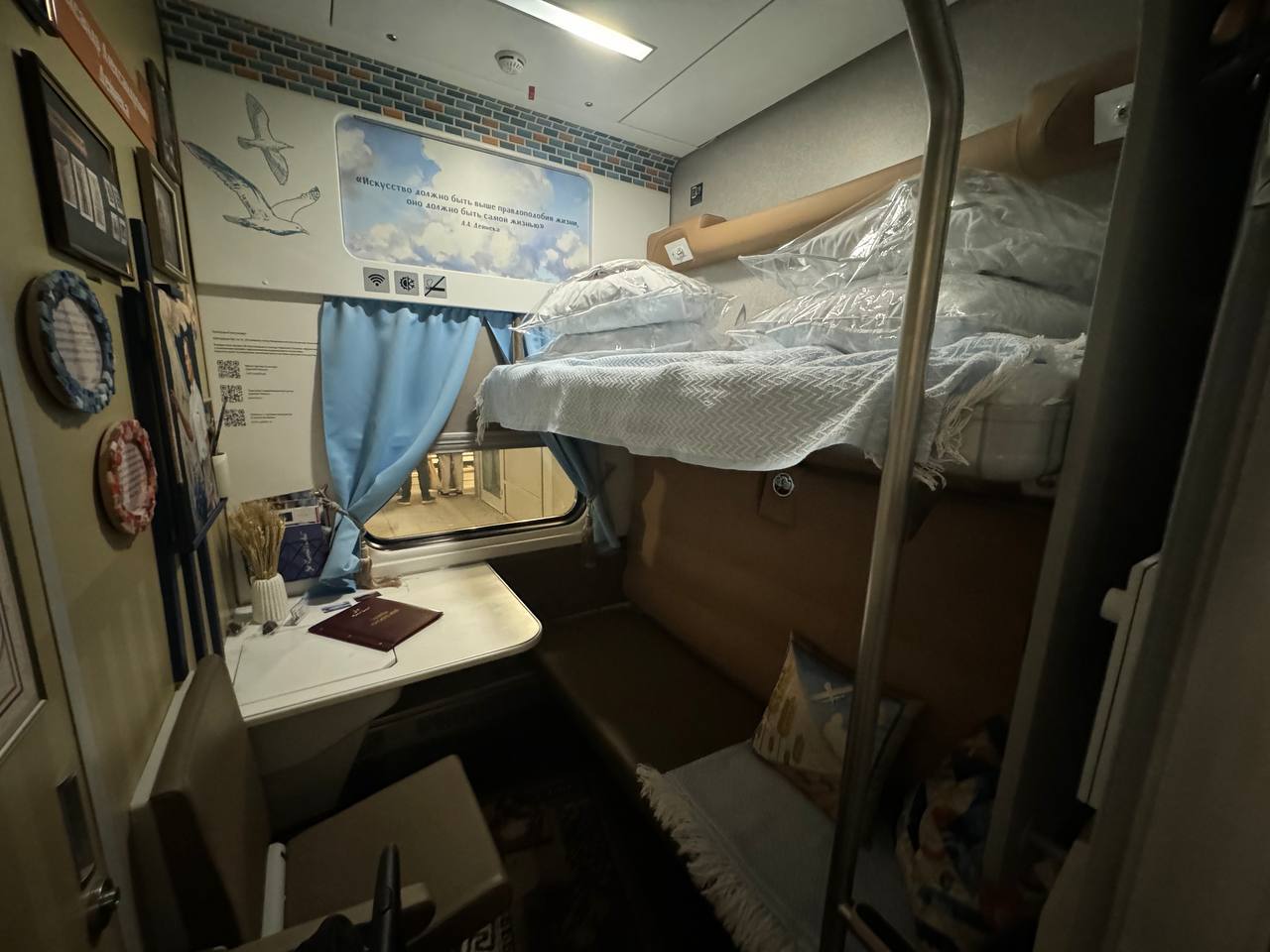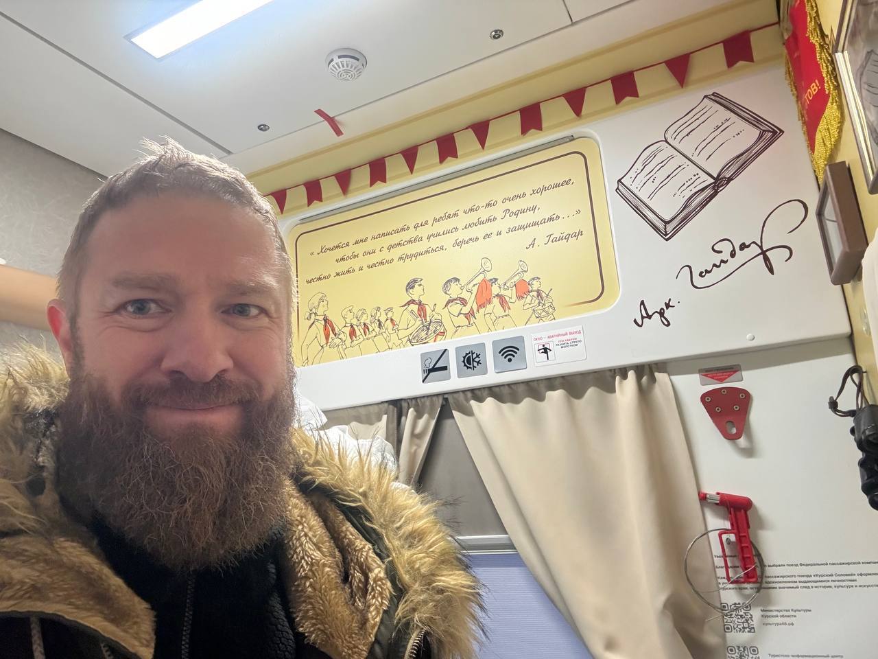 Кстати, мне как раз досталось купе, посвящённое художнику Александру Дейнеке – одному из самых известных уроженцев Курской области. А вот рядом оказалось соседнее купе, посвящённое Аркадию Гайдару. Эх… знал бы заранее – выбрал бы его!)
