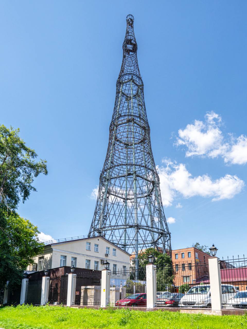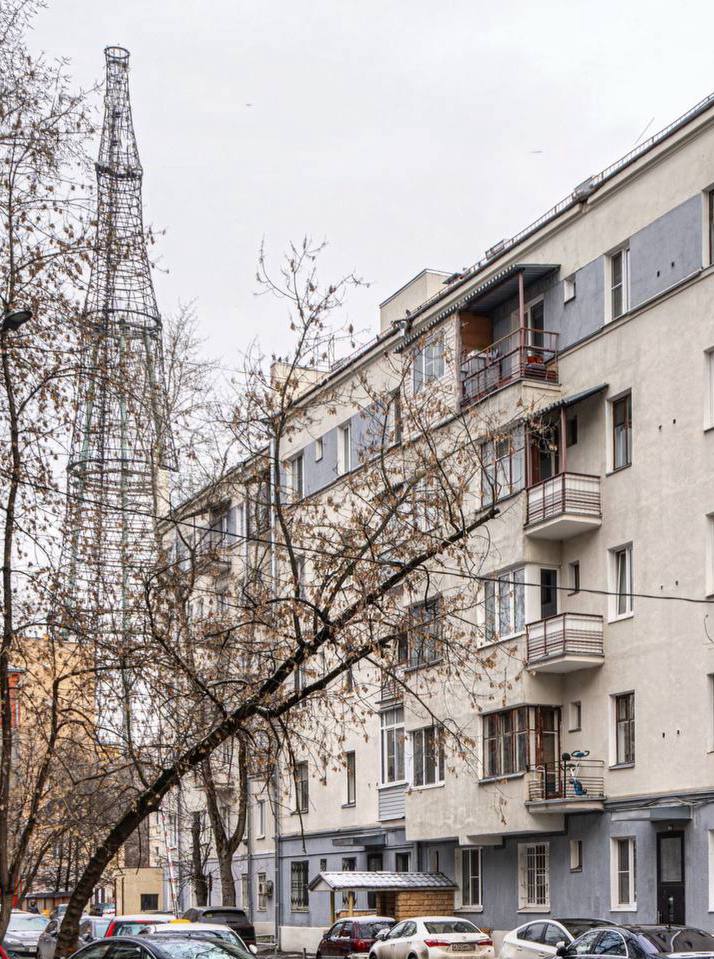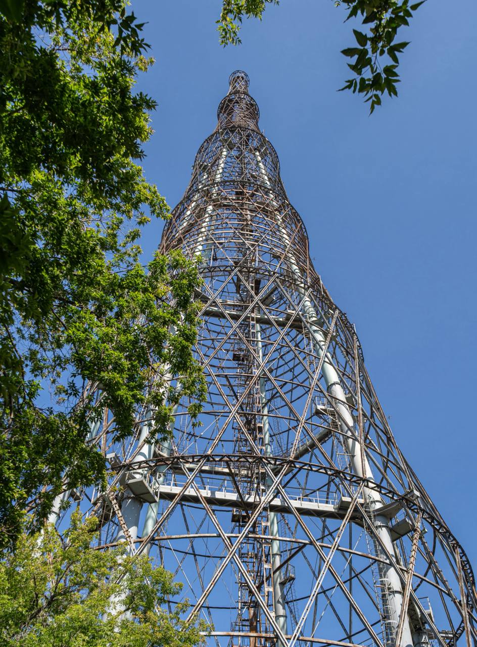 Знаменитая Шуховская башня была им спроектирована на высоту 350 м, что на 40 м выше Эйфелевой башни. Эйфелева башня весит 7300 тонн, а расчетная масса Шуховской должна была составить 2200 тонн. К сожалению, ее пришлось укоротить до 148,5 м из-за нехватки железа в молодой республике после первой мировой войны. При этом масса башни составила всего 240 тонн. До постройки Останкинской телебашни Шуховская башня была самым высоким объектом в Москве. Она является доминантой района и, как вы можете заметить на моих фото, её видно отовсюду.