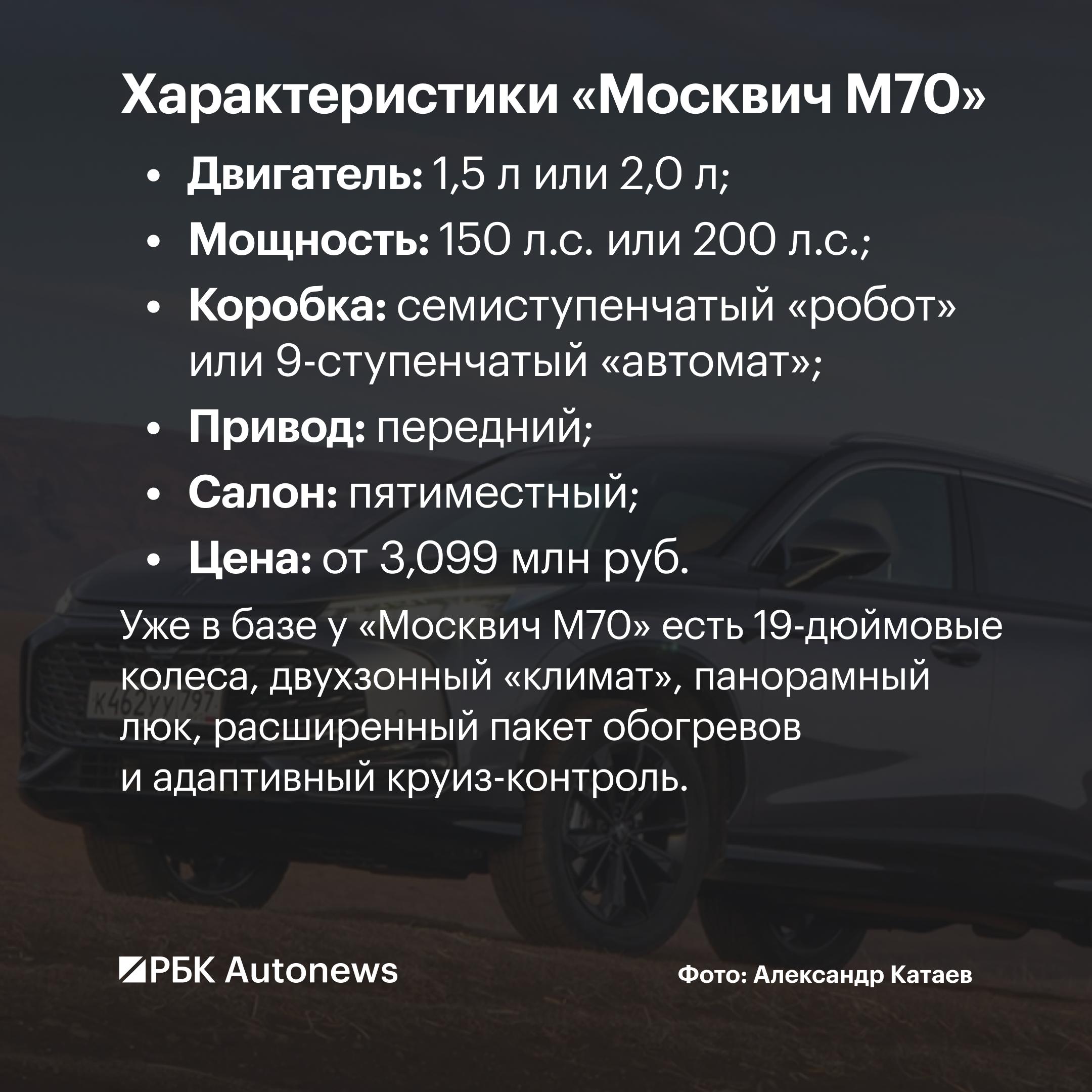 Бренд «Москвич» представил кроссоверы новой престижной линейки «М». Наиболее доступный из них — «Москвич М70». Автомобиль предлагается в двух комплектациях по цене от 3 099 000 руб. до 3 499 000 руб. Новинка представлена лишь с передним приводом.