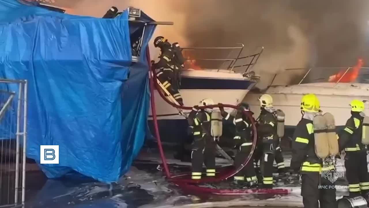 Кадры тушения трех катеров на берегу Москвы-реки показали в столичном МЧС.