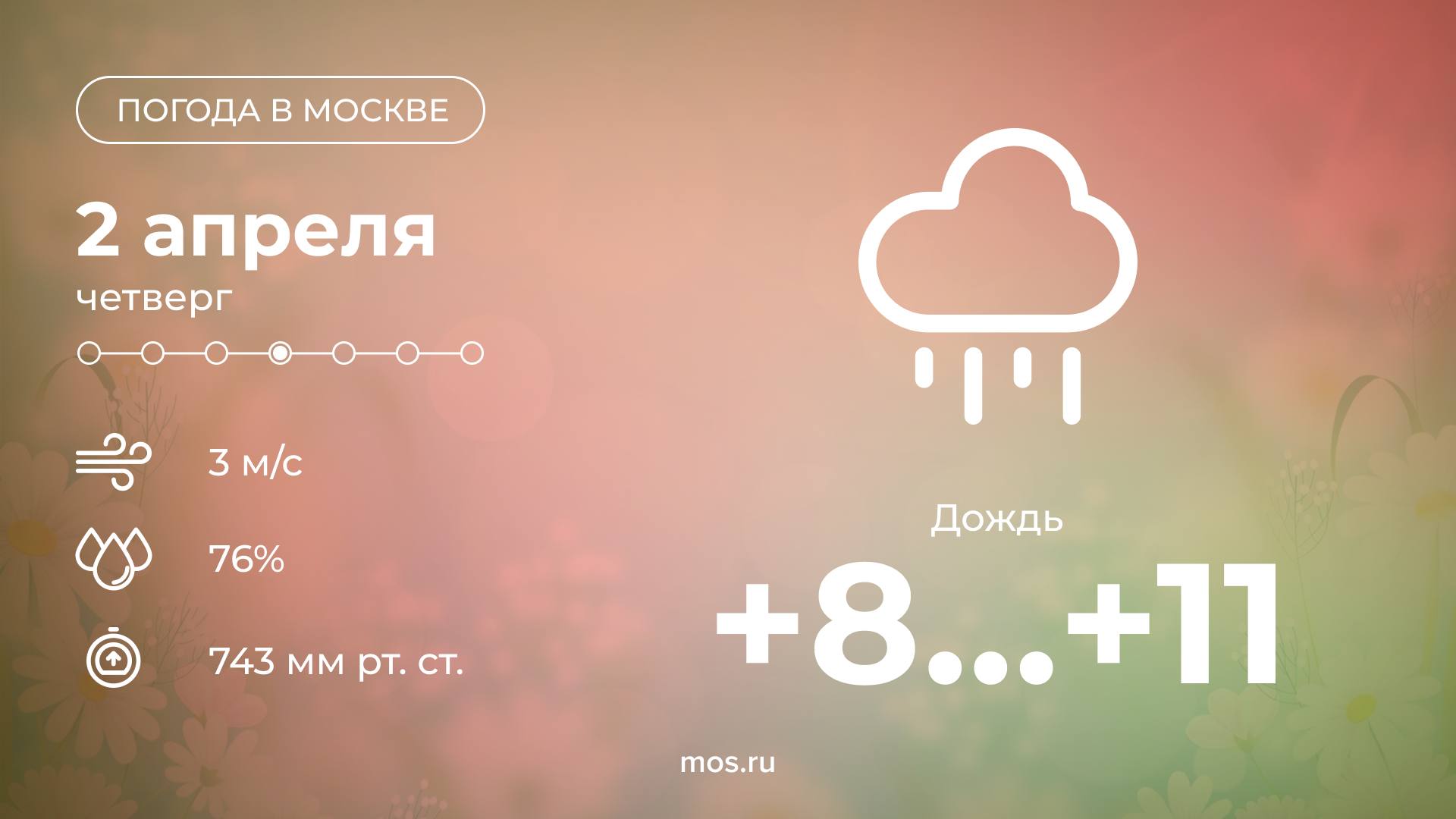 Доброе утро! Сегодня в столице будет пасмурно, в течение дня будет идти дождь. Столбики термометров покажут от +8 до +11 °С.