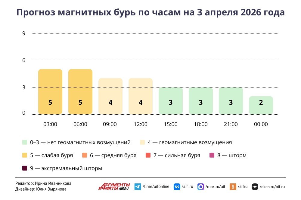 В первой половине дня ожидается возбужденная геомагнитная обстановка, вероятность магнитных бурь составляет 41%, геомагнитных возмущений — 40%.