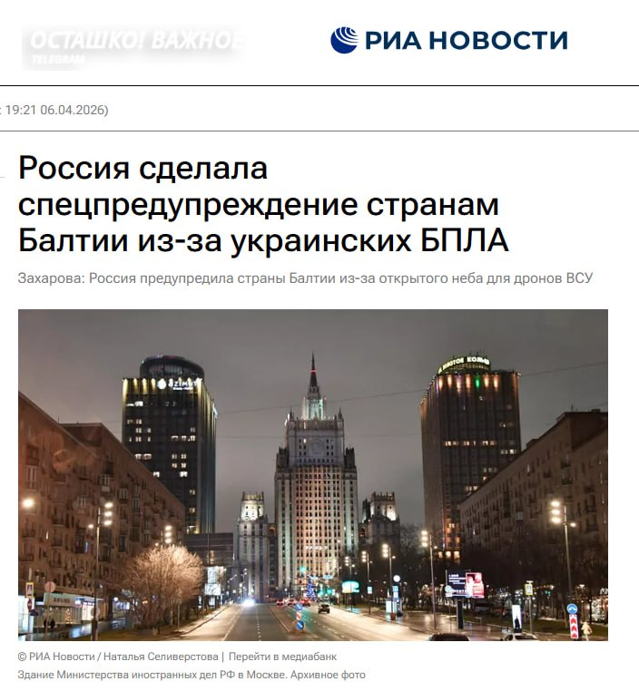 Официальный представитель МИД Мария Захарова заявила, что Россия направила специальное предупреждение странам Балтии в связи с их решением открыть воздушное пространство для пролёта украинских Дронов для атак на Россию.