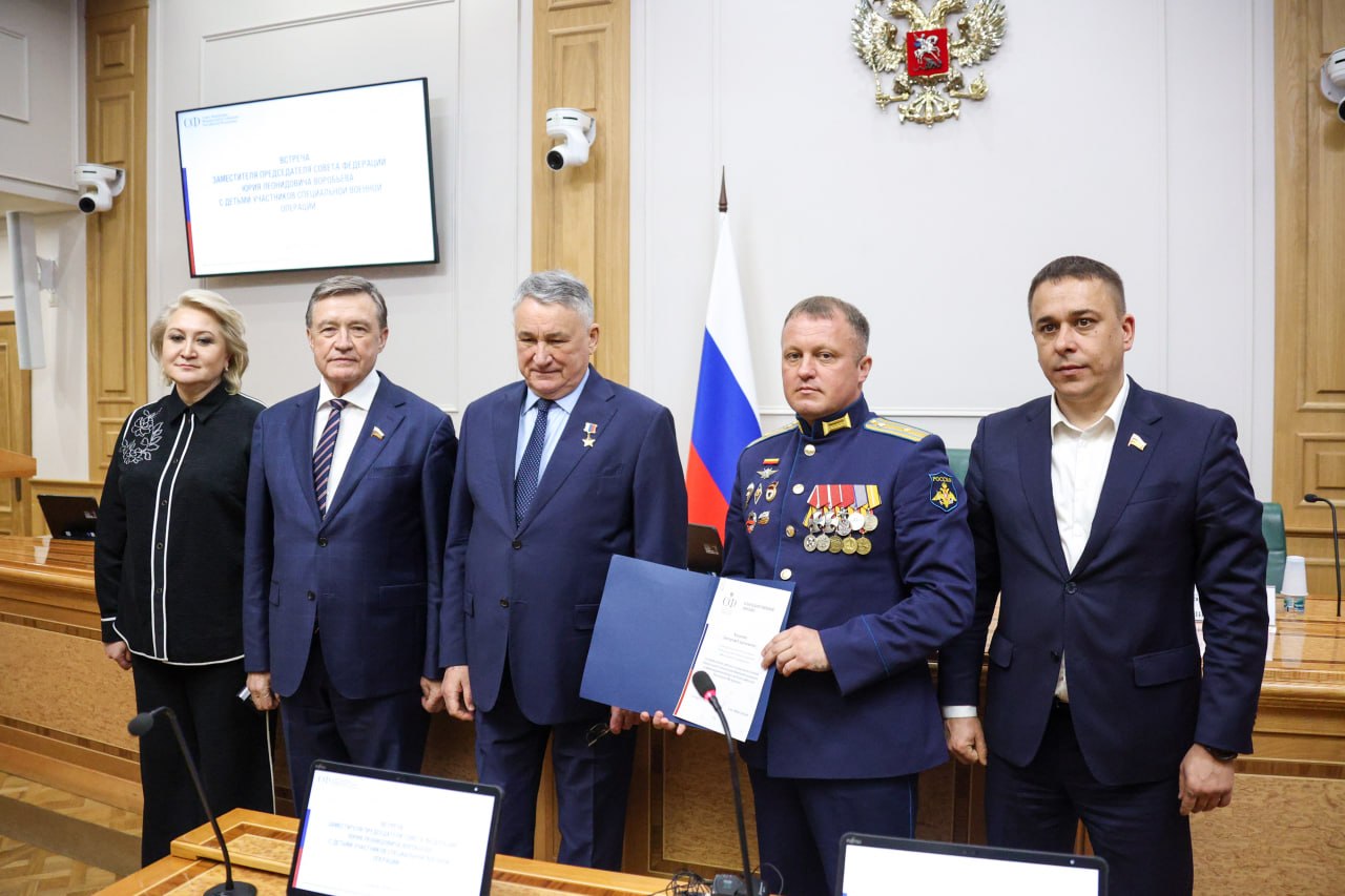 Заместитель Председателя СФ Юрий Воробьёв, председатель Комитета СФ по науке, образованию и культуре Лилия Гумерова, первый заместитель председателя Комитета СФ по бюджету и финансовым рынкам Сергей Рябухин и член Комитета СФ по науке, образованию и культуре Айрат Гибатдинов встретились в Совете Федерации с детьми участников специальной военной операции.