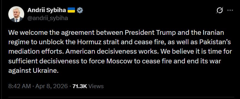 Мы приветствуем соглашение между президентом Трампом и иранским режимом о разблокировании Ормузского пролива и прекращении огня, а также посреднические усилия Пакистана. Американская решимость работает. Мы считаем, что настало время проявить достаточную решимость, чтобы вынудить Москву прекратить огонь и положить конец её войне против Украины.