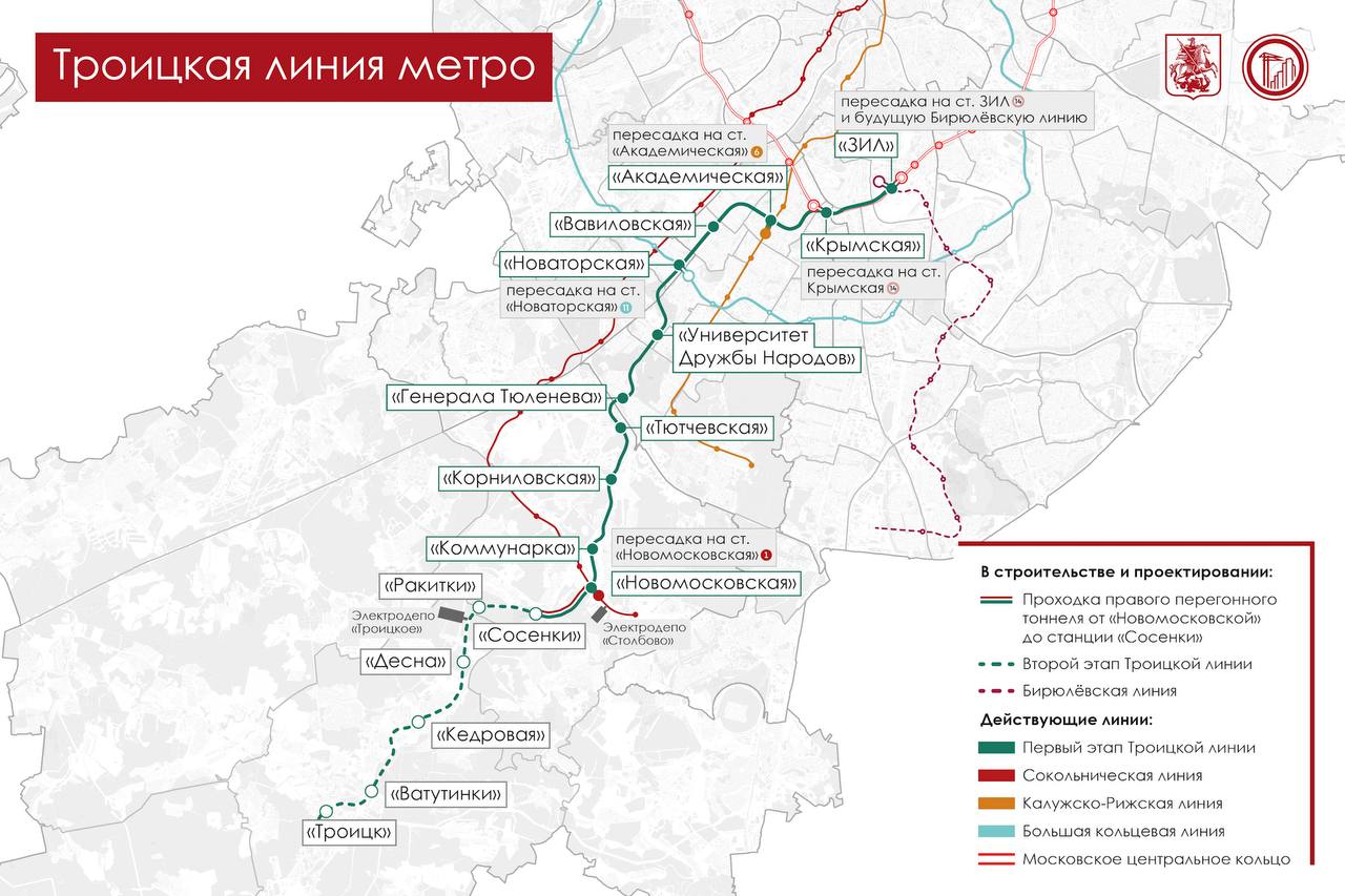 Южный участок Троицкой ветки пройдёт вдоль Калужского шоссе — от Коммунарки до Троицка. Откроются шесть станций: "Сосенки", "Ракитки", "Десна", "Кедровая", "Ватутинки", "Троицк".