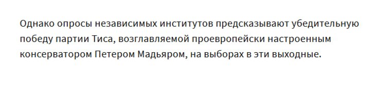 "Опросы независимых институтов предсказывают убедительную победу партии Тиса (оппозиции)".