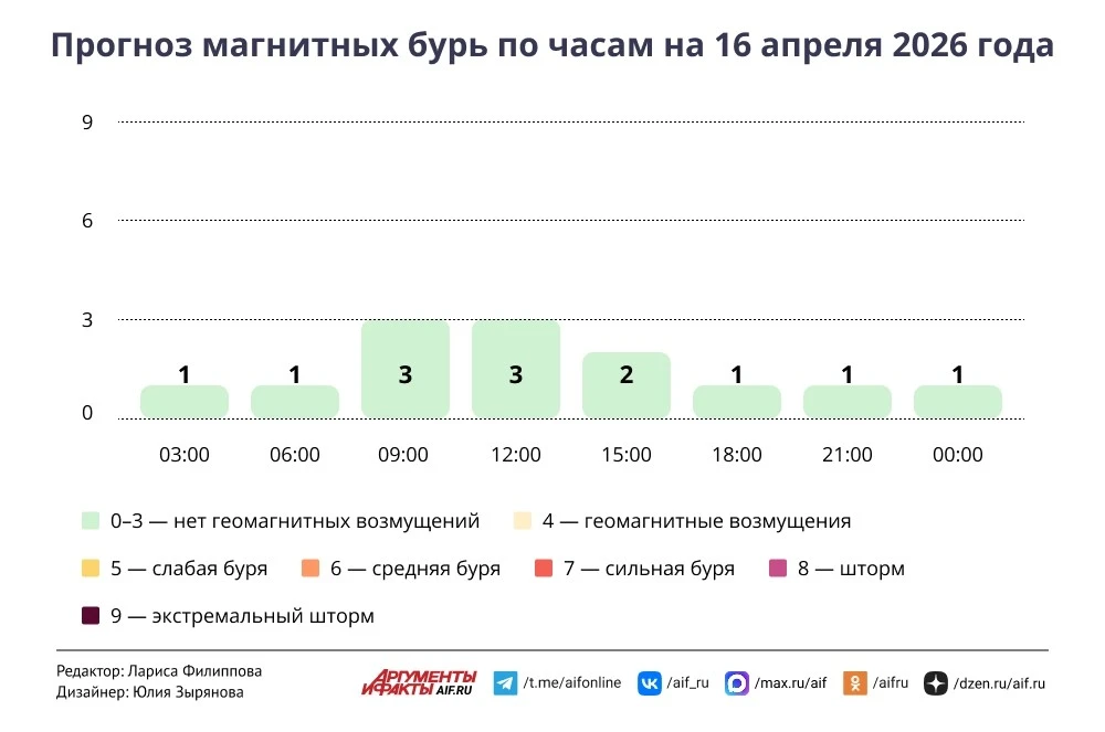 При этом геомагнитная обстановка, по прогнозам, спокойная. Вероятность магнитных бурь составляет 7%.