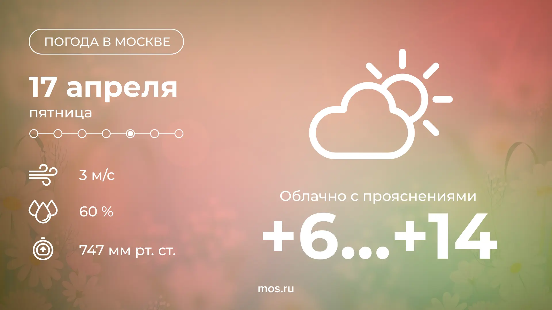Доброе утро! Сегодня в столице будет облачно с прояснениями, местами возможен небольшой дождь. Не забудьте взять с собой зонтик!