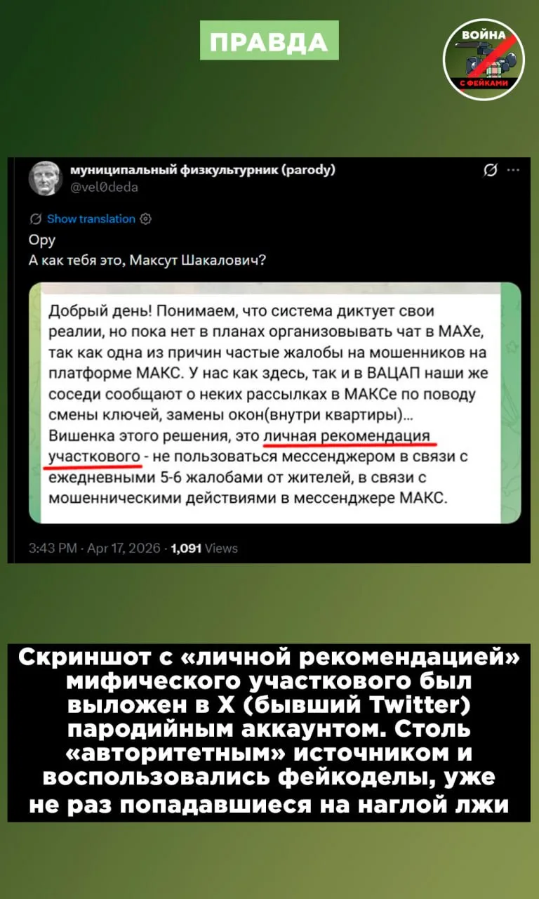 Официальные рекомендации полиции о недопустимости использования MAX отсутствуют. Мессенджер дает возможность для комфортной и безопасной работы с ЖКХ-сервисами. Поэтому если участковый, давший рекомендации, и правда существует, то ему следует научиться проверять информацию и развить в себе соответствующие навыки.