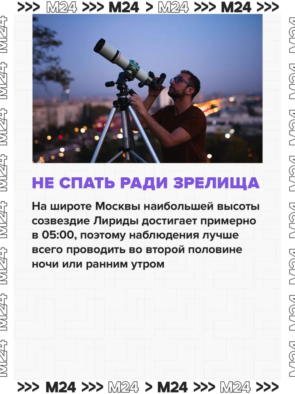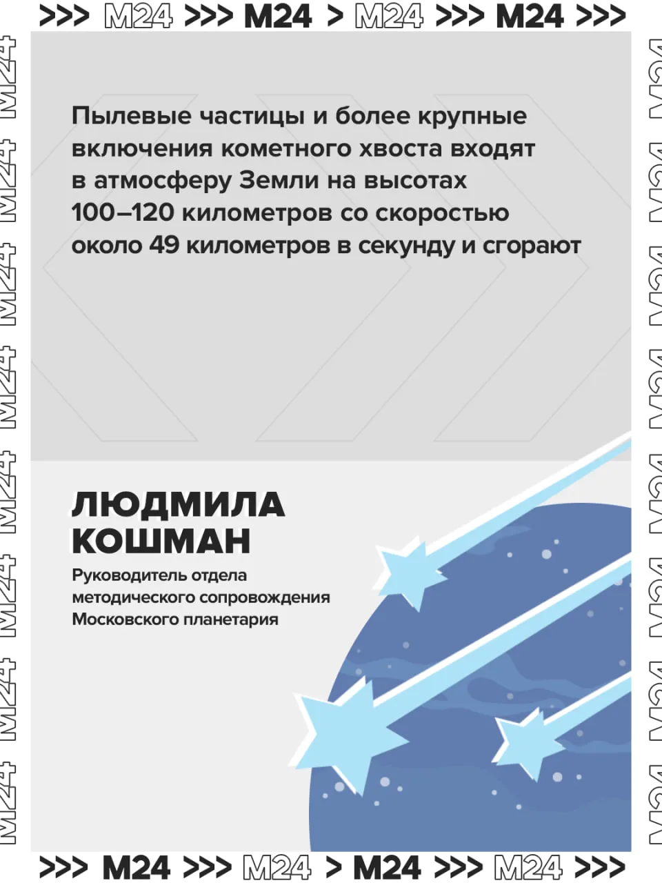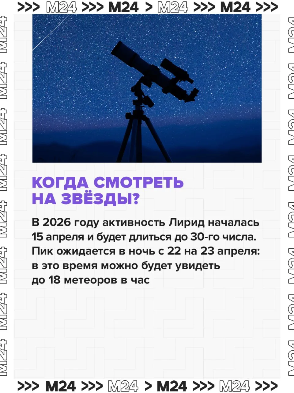 Пик ожидается в ночь с 22 на 23 апреля. Можно будет заметить до 18 вспышек в час, рассказала «Москве 24» астроном и руководитель методического сопровождения Московского планетария Людмила Кошман.