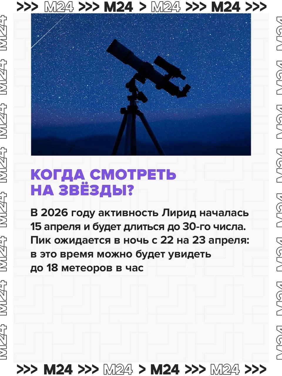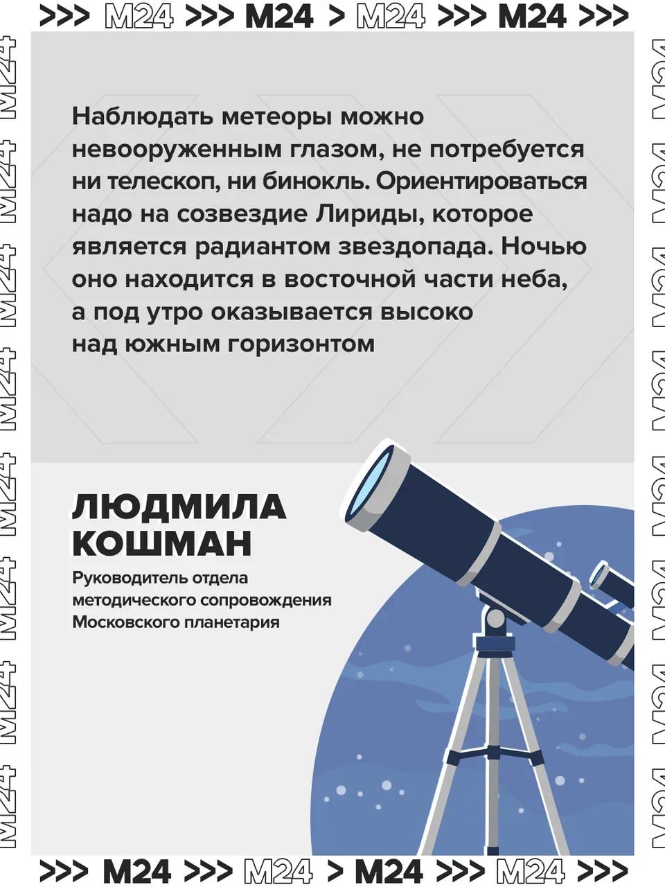 Пик метеорного потока Лириды ждём в ночь с 22 на 23 апреля — до 18 вспышек в час, рассказала «Москве 24» астроном Московского планетария Людмила Кошман.