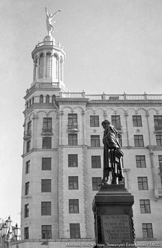 Скульптура находилась на угловой башне дома на пересечении улицы Горького (ныне Тверская) и Тверского бульвара, построенного в 1940 году, и представляла женскую фигуру с поднятыми руками и развевающейся юбкой.