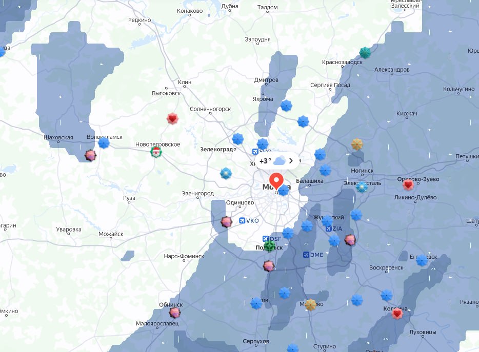 Снег постепенно подбирается к Москве, осадки уже зафиксировали в Клину, Дмитрове и Волоколамске. Температура колеблется около +2°C.