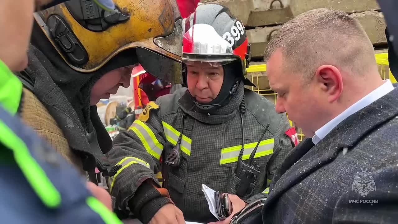 По периметру здания установлены подъемные механизмы, внутри продолжают работу звенья газодымозащитной службы.