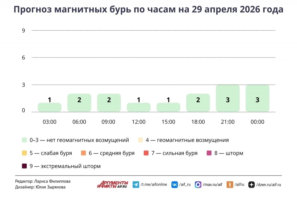 В среду, 29 апреля, ожидается спокойный геомагнитный фон. Вероятность магнитных бурь составляет 31%.