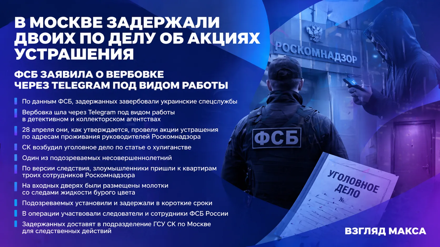 Как сообщили в Центре общественных связей ФСБ России, задержанные 28 апреля 2026 года по заданию куратора провели акции устрашения по адресам проживания четырёх руководителей Роскомнадзора.