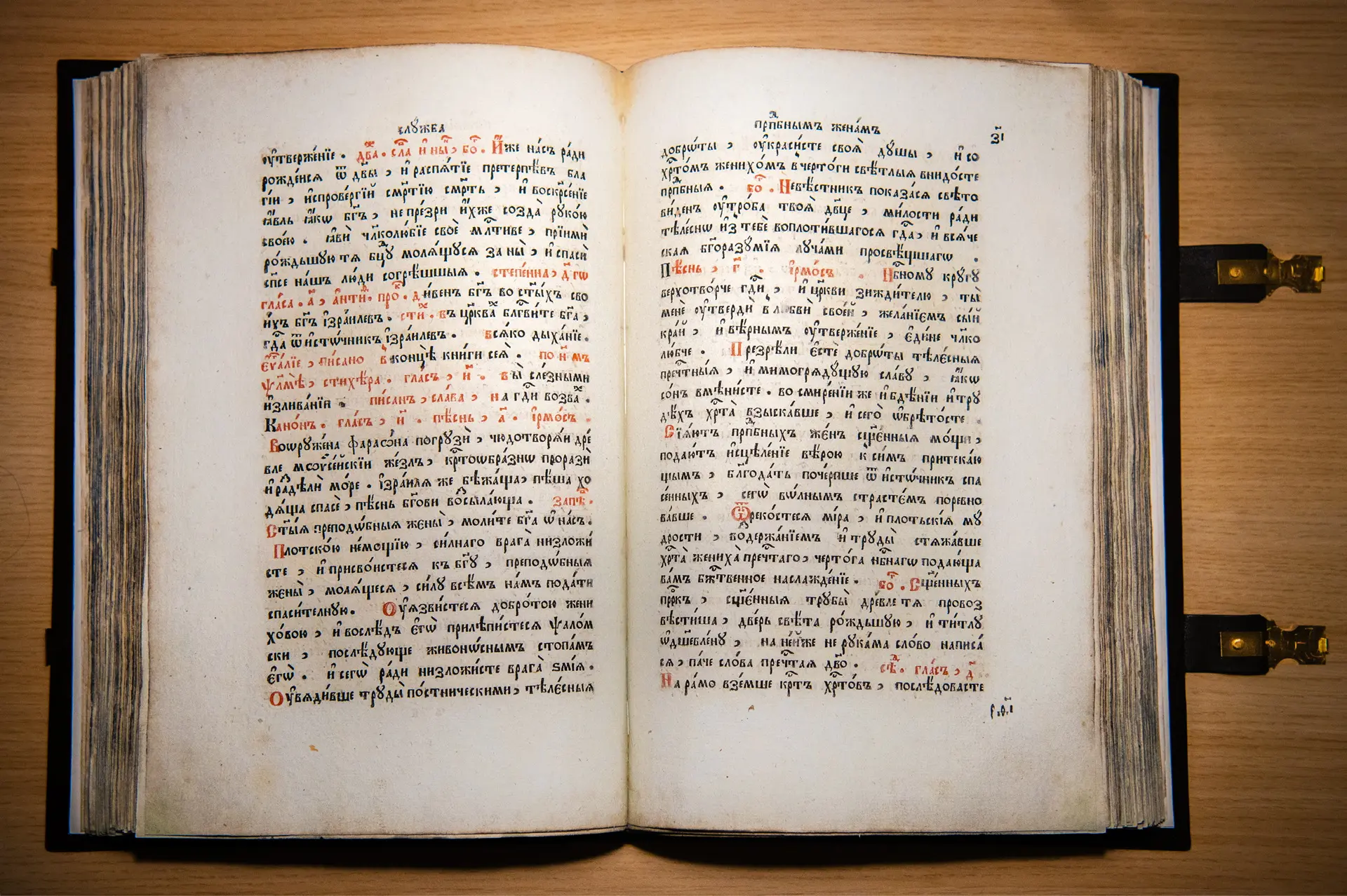 Чтобы восстановить Минею, её буквально разобрали на отдельные страницы. Каждую чистили, мыли, убирали старый клей, воск, жировые пятна. Рваные края укрепляли, подбирали бумагу, которая по составу и цвету похожа на оригинал. Потом каждую страницу аккуратно прессовали, заново собирали в тетради и прошивали вручную на специальном станке. Даже кожаный переплёт, хоть и был очень хрупким, смогли сохранить со всеми его узорами. Это ювелирная работа, требующая огромного опыта и терпения.