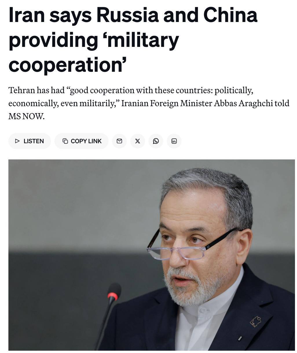По словам министра иностранных дел Аббаса Аракчи, Тегеран считает Москву и Пекин стратегическими партнерами и продолжает взаимодействие с ними, в том числе в военной сфере.