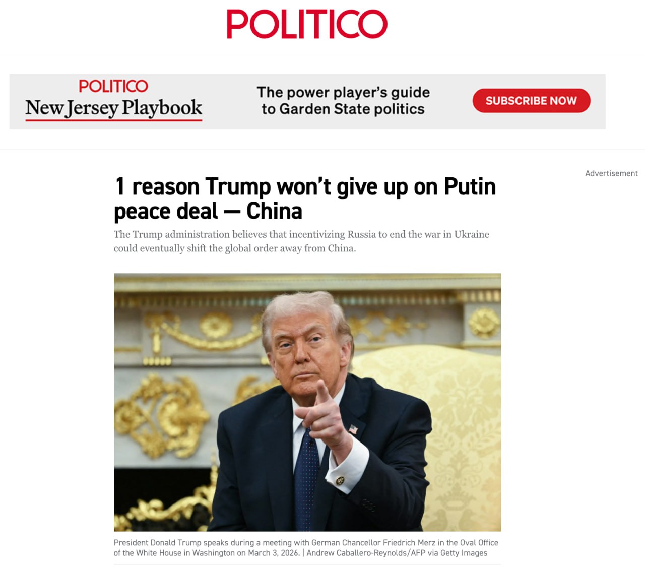 «Стратегия национальной безопасности, опубликованная в ноябре, уделяет значительное внимание Китаю, хотя Пекин часто не упоминается напрямую. Многие американские законодатели — от обеих партий — считают Китай самой серьёзной долгосрочной угрозой для глобальной мощи США.„Существует давняя стратегическая логика США, согласно которой союз России и Китая не отвечает нашим интересам, и необходимо искать способы их разделить или хотя бы временно сотрудничать с тем партнёром, который представляет меньшую долгосрочную угрозу“, — заявил Александр Грей, бывший глава аппарата Совета национальной безопасности при Трампе».