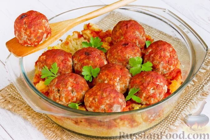 Удобное и сытное блюдо, в котором мясные тефтели запекаются вместе с гарниром. Для особого вкуса картошку лучше предварительно отварить и размять, чтобы она пропиталась мясными соками во время запекания.