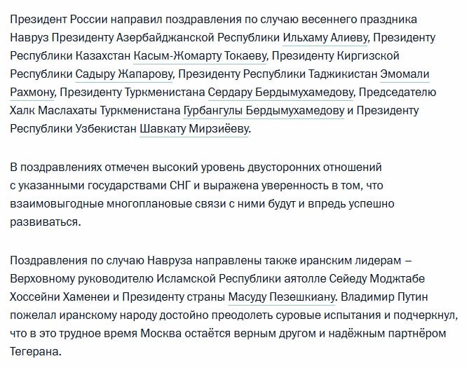 Путин поздравил с праздником Навруз руководство Ирана, пожелав иранскому народу достойно пройти выпавшие ему суровые испытания.