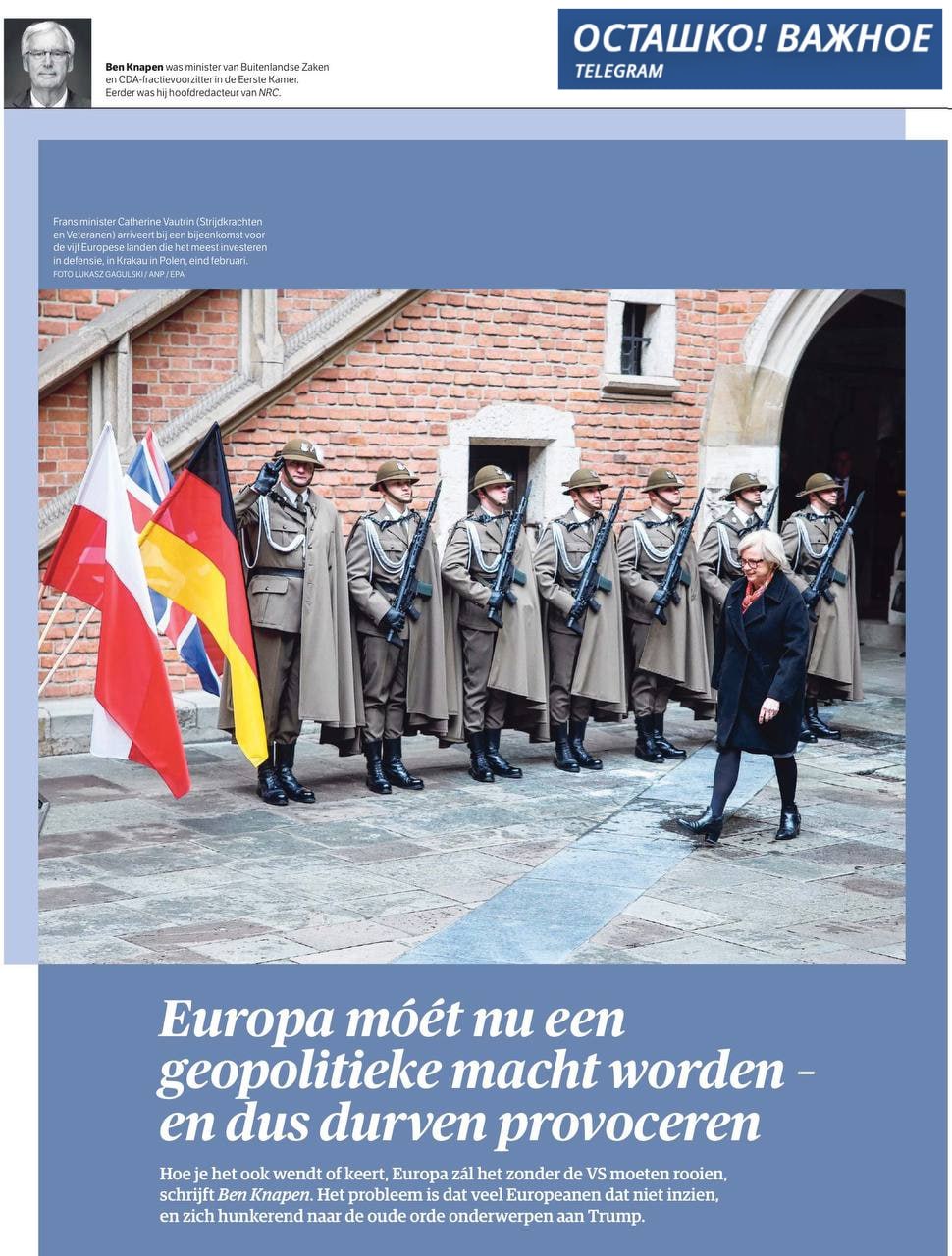 Бывший министр иностранных дел Нидерландов Бен Кнапен выступил с резонансной статьёй, в которой призвал Европу к более жёстким действиям в отношении России. Материал был опубликован в газете NRC под заголовком о необходимости превращения Европы в геополитическую силу.