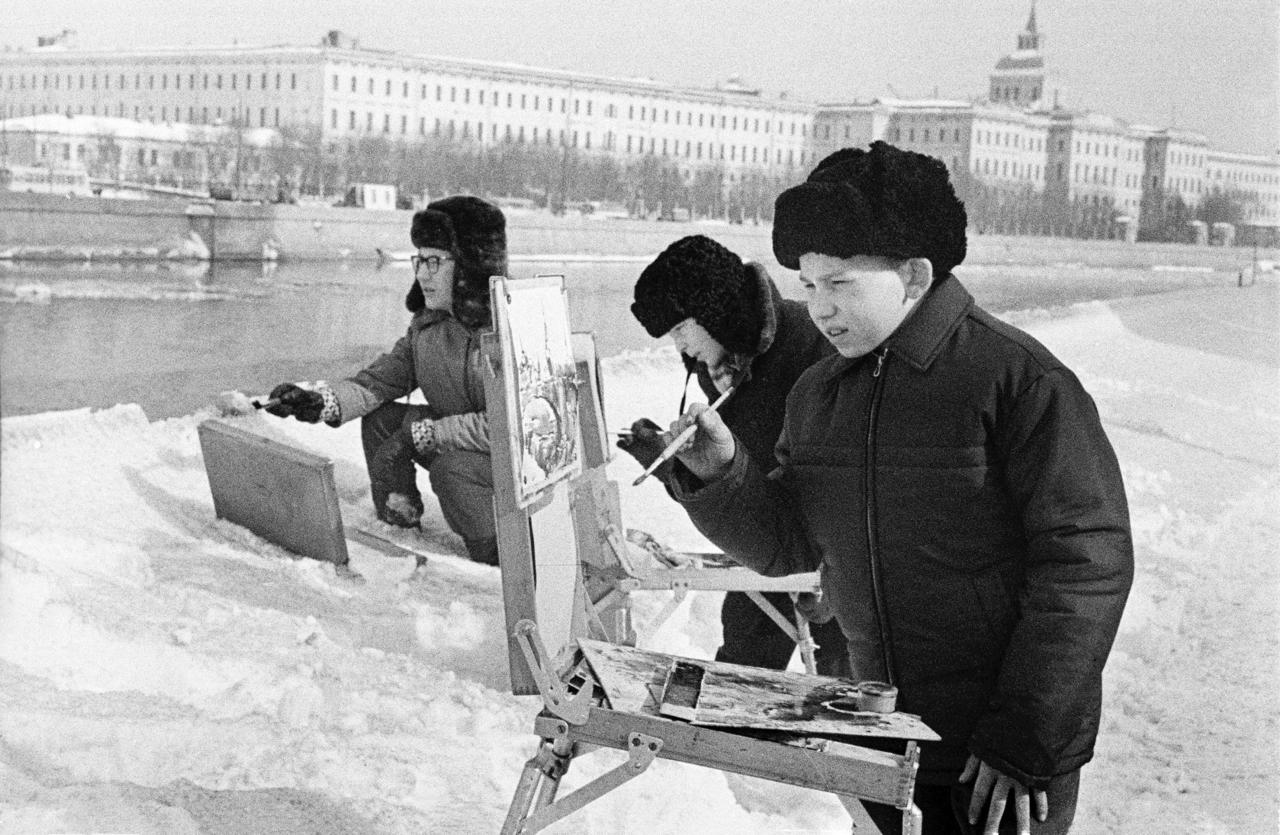 Фотофакт: Учащиеся художественной школы при Московском государственном институте им. В.И. Сурикова на весенних этюдах. Москва. 14 марта 1970 г. Фото О. Булдакова. Главархив Москвы