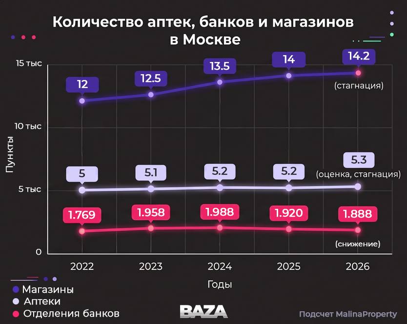 Число ПВЗ в Москве с 2022года выросло почти в два раза, подсчитала «База» по данным компании MalinaProperty. Число магазинов, аптек и банков почти не поменялось. По примерным подсчётам, сегодня на один ПВЗ в столице приходится до 350человек, тогда как на один банк — около семи тысяч, аптеку — до 2,5тыс. человек, на магазин — около тысячи человек.