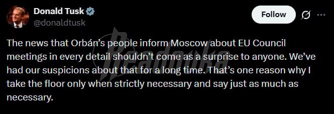 «Люди Виктора Орбана» якобы в мельчайших подробностях информируют Москву о заседаниях лидеров ЕС, заявил премьер-министр Польши Дональд Туск. По словам политика, подозрения на этот счет ходили давно, поэтому он старается не откровенничать с венгерской стороной. По информации Politico, неофициально Евросоюз уже ограничил участие Будапешта в конфиденциальных переговорах.