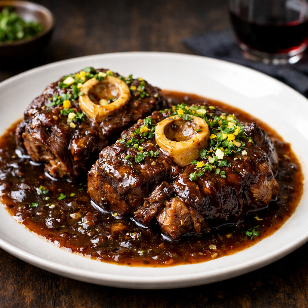 Подавайте оссобуко горячим, посыпав цедрой лимона и рубленой петрушкой. Это блюдо ярко сочетается с ризотто по-милански, картофельным пюре или полентой, обеспечивая гастрономическое наслаждение для всех.