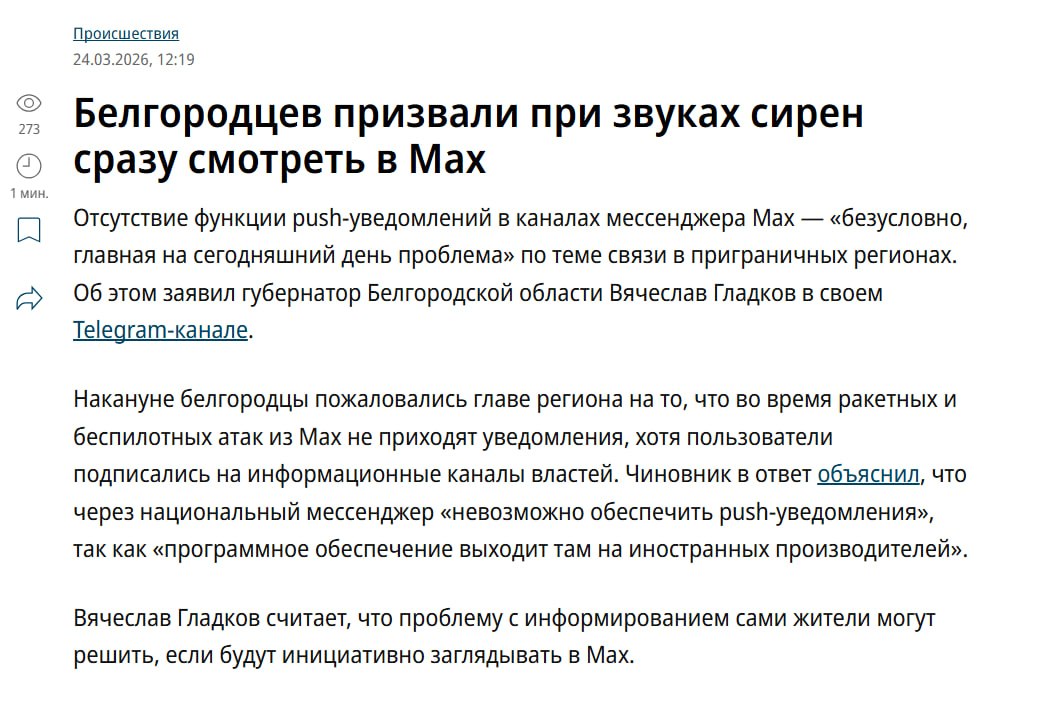 Национальный мессенджер Max, куда всех загоняют под предлогом безопасности, не в состоянии обеспечить отправку пуш-уведомлений о ракетной опасности населению, которому отключают общемировой интернет под предлогом обеспечения той же самой безопасности.