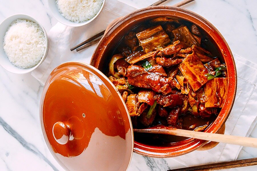- После этого влить шаосинское вино, соусы хойсин и соевый, добавить устричный соус, кунжутное масло и перец. Влить воду и довести до кипения, после чего убавить огонь и тушить 1 час, периодически помешивая.