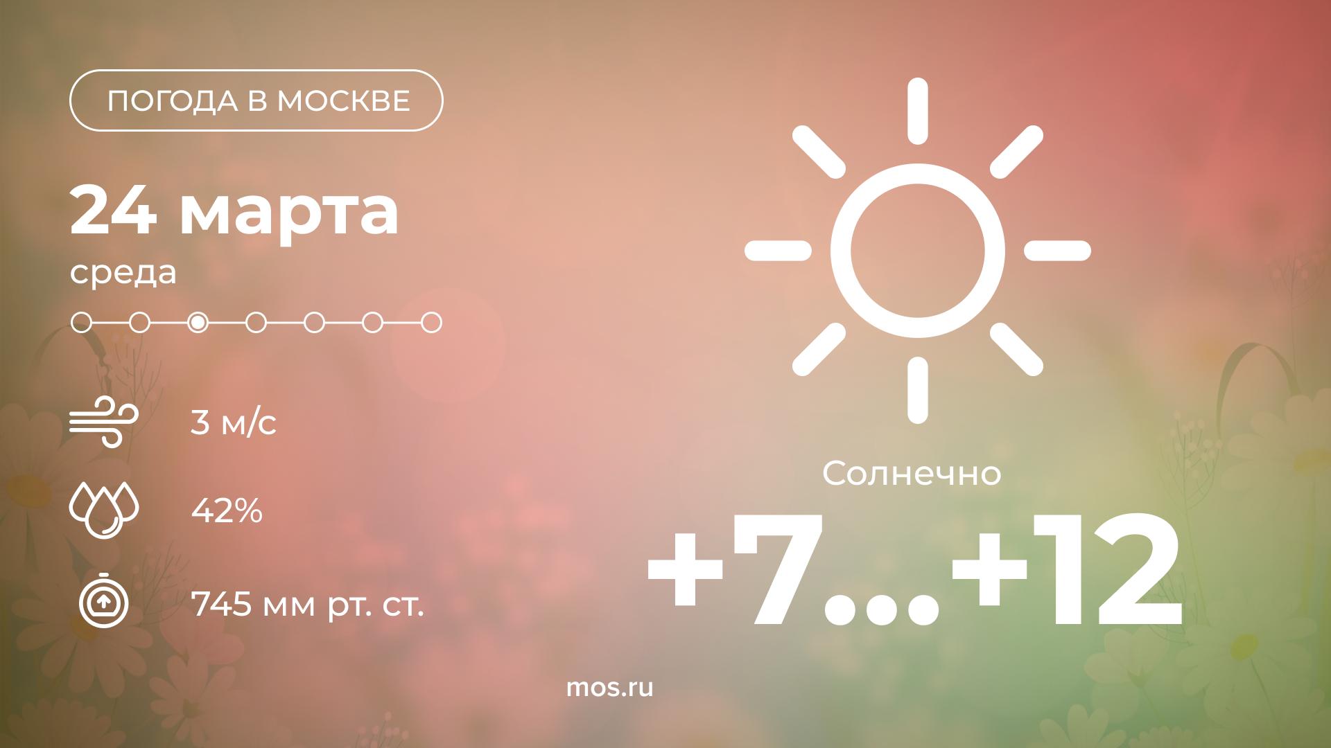 Сегодня в Москве ожидается ясная погода. Столбики термометров покажут от +7 до +12 °С.
