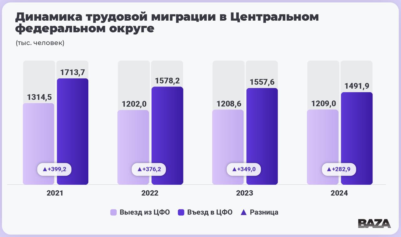 Модель «все едут в столицу» перестаёт работать в прежнем виде: разница между приезжими в Центральный федеральный округ и уехавшими оттуда постепенно сокращается. По данным Росстата, в 2021 году разрыв составлял 399 тысяч человек, в 2024 году — 282 тысячи. По информации «Базы», особенно трудовая миграция прослеживается среди IT-специалистов, дизайнеров, маркетологов, SMM-менеджеров и других представителей креативного сектора — у тех, кто может позволить себе работать удалённо.
