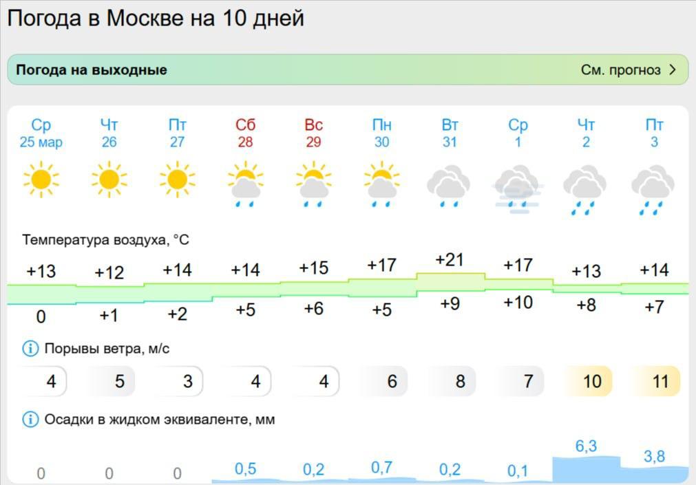 Москву ждут первые в этом году дожди. И сразу затяжные. Синоптики обещают, что начнутся с выходных. А в самом конце марта прогнозируют до +21 °С.
