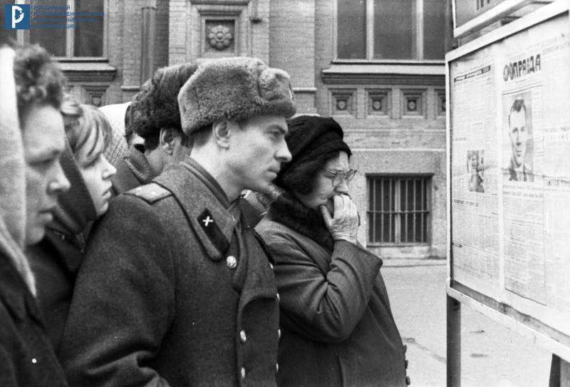 На фото: Гагарин в кабине МиГ-15УТИ(1); фрагменты фюзеляжа МиГ-15УТИ на месте авиакатастрофы (2,3); москвичи у стенда с газетами о трагической гибели экипажа (4); траурный кортеж на Красной площади (5); похороны Героев Советского Союза (6).