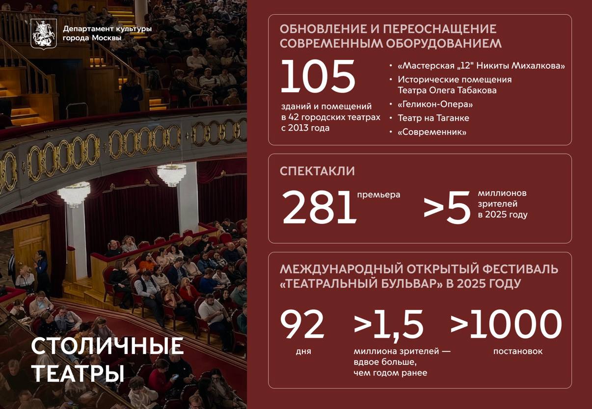 В 2026-м планируем продолжить модернизацию Московского театра оперетты, Театра Олега Табакова (Малая Сухаревская площадь, д. 5), Театра Моссовета и Театра Сатиры (Прогресс-сцена Армена Джигарханяна).