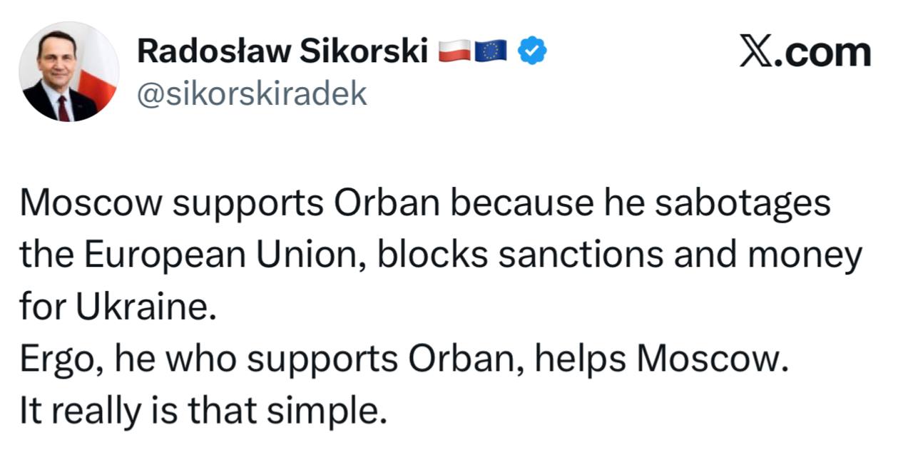 Москва поддерживает Орбана, потому что он саботирует Европейский союз, блокирует санкции и финансирование Украины. Следовательно, тот, кто поддерживает Орбана, помогает Москве. Всё действительно так просто.