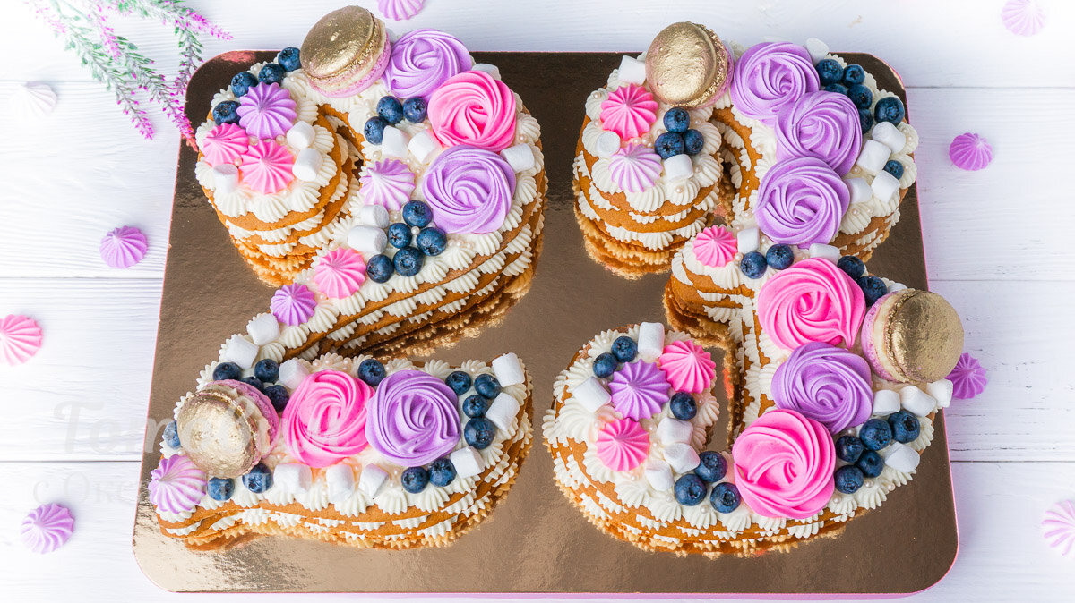 5. Собираем торт: На коржи нанесите крем и джем, формируя цифры. Последний слой посыпьте украшениями.