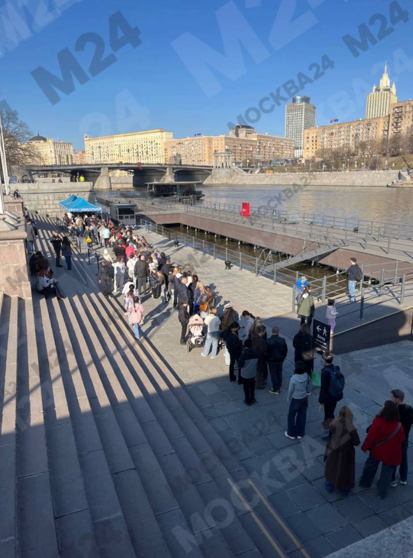 У причала Киевский сегодня собралась такая очередь из желающих прокатиться на речном транспорте. Так что, если планируете прогулку, закладывайте время.
