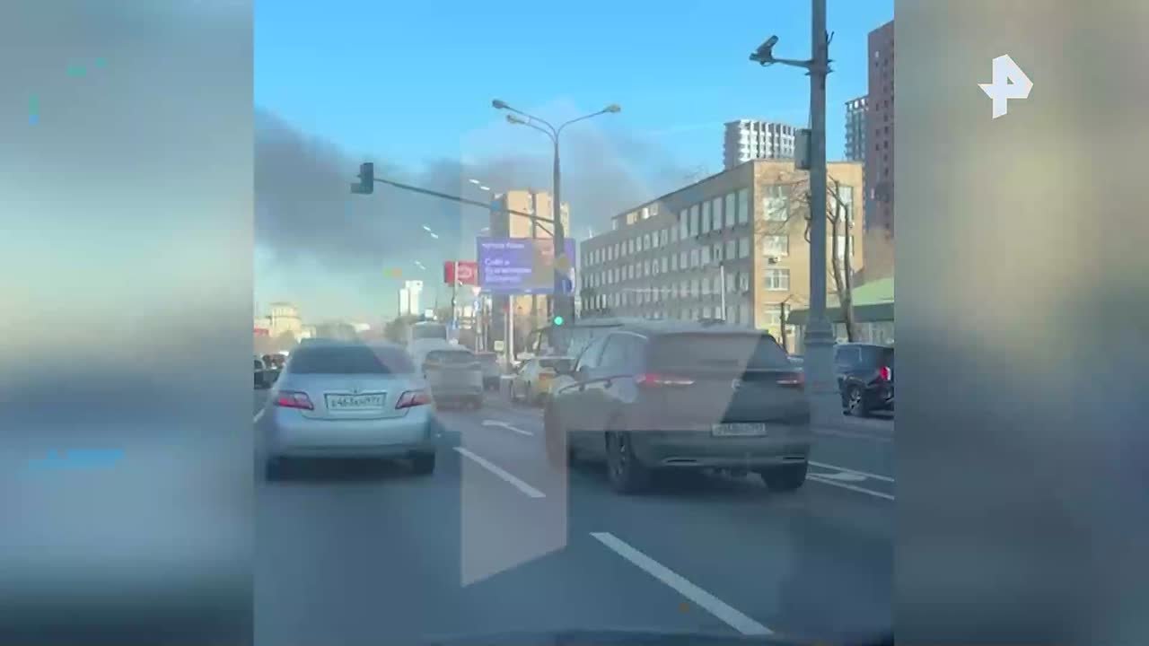 На кадрах РЕН ТВ — видны черные клубы дыма, поднимающиеся вверх.