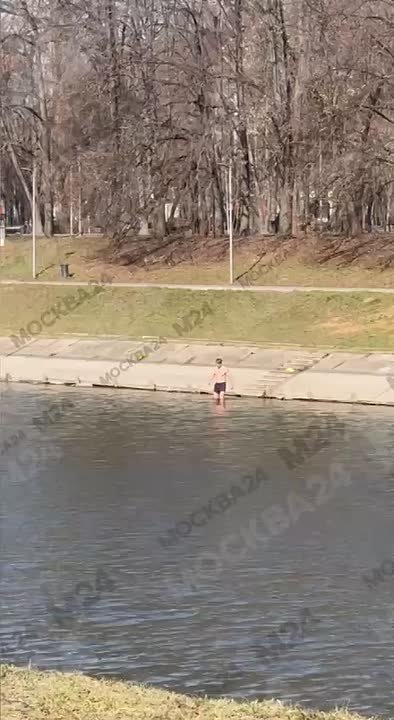 В районе Тушино компания в плавках уютно устроилась на лужайке. Один из них даже решил окунуться.