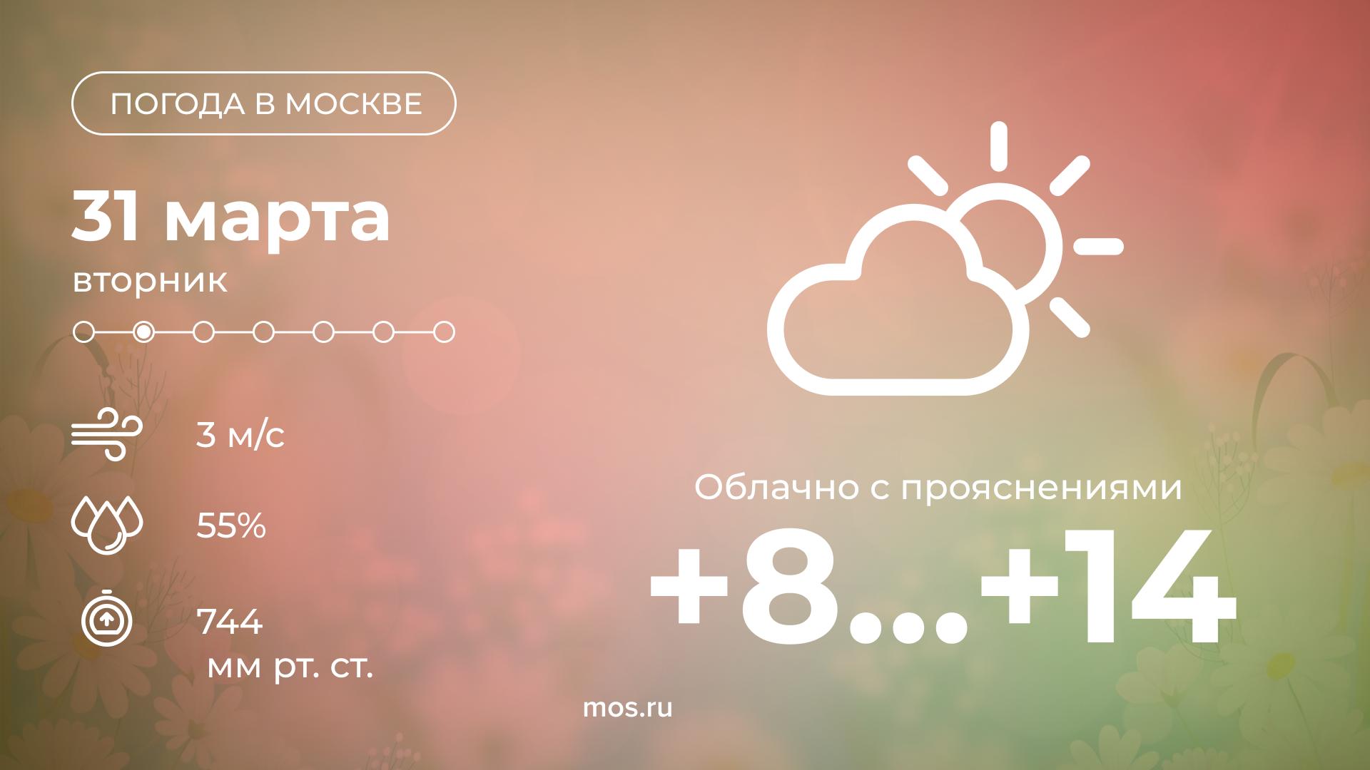 Доброе утро! Сегодня в Москве будет облачно с прояснениями. Столбики термометров покажут от +8 до +14 °С.