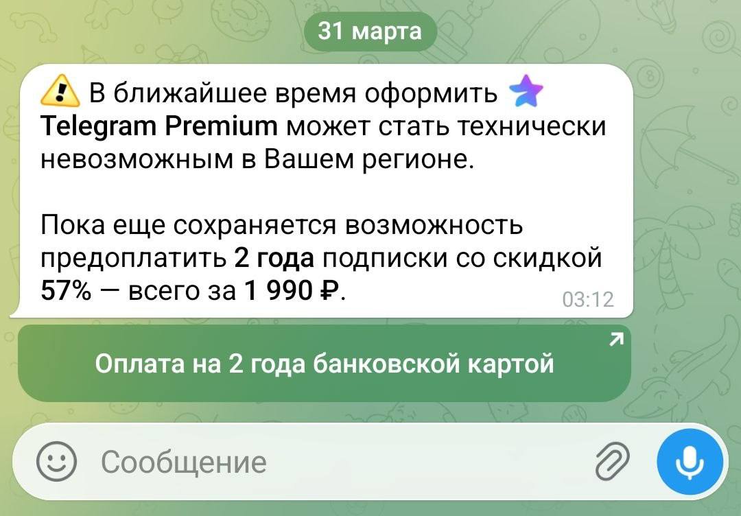 Сэкономить не получится: предложение купить двухлетнюю подписку Telegram Premium за 1990 рублей оказалось… видимо, первоапрельским розыгрышем.