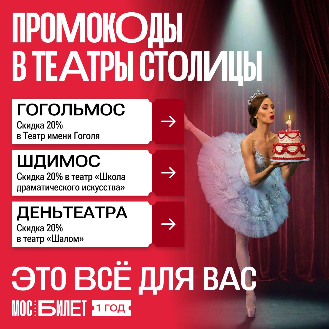 «Мосбилету» — 1 год! Продолжаем отмечать.В честь этого делимся с вами промокодами, которые можно использовать при покупке билетов в сервисе.
